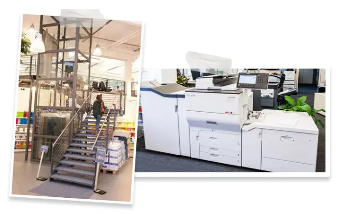 Umzug und Erweiterung des Printcenters in das neugestaltete Obergeschoss des Fachmarkts. Ein Glasaufzug ermöglicht den barrierefreien Zugang zu den neuen offenen Galeriaräumen.