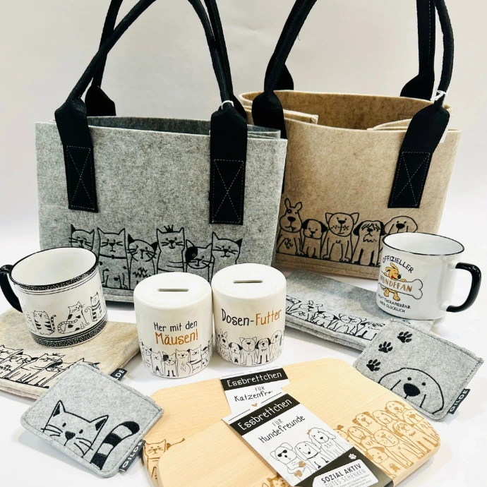 Für Hunde- und Katzenfans - ob Tasse oder Filztasche – die liebevoll gestalteten Artikel sind schöne Begleiter für jeden Tag und bringen die Tierliebe charmant zum Ausdruck. Ideal zum Verschenken oder einfach, um sich selbst eine Freude zu machen.