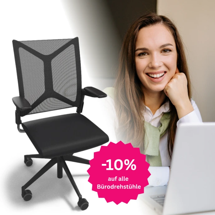 Auf alle lagernden Bürodrehstühle erhalten Sie 10 % Rabatt. Für mehr Sitzkomfort, Ergonomie und ein besseres Arbeiten im Alltag.